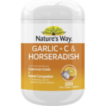 Nature’s Way Garlic + C & Horseradish Helps reduce symptoms of common colds and flu, and hay fever.