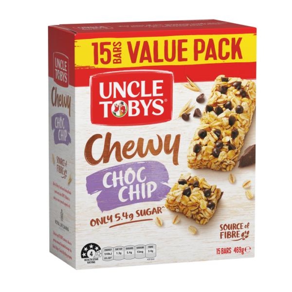 Product Details UNCLE TOBYS Msli Bars Cchp VPck469g UNCLE TOBYSChewy Choc Chip Muesli Bars are loaded with tasty, chewy chocolate