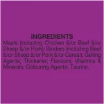 Meats (including Chicken &/or Beef &/or Sheep &/or Pork); Binders (including Beef &/or Sheep &/or Pork &/or Cereal); Gelling Agents; Thickener; Flavors; Vitamins & Minerals; Colouring Agents; Taurine.